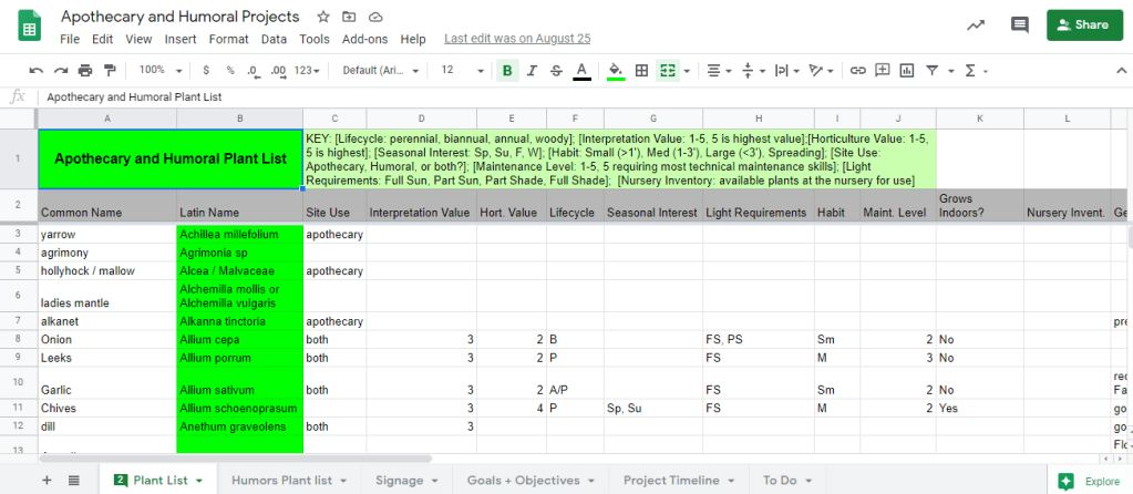 Next to go in are plants for each bed, along with a sun dial in the middle of the garden. A plant list was devised for each bed with considerations for aesthetics, maintenance, and relatability to the public. For example, we aim to showcase period plants that might be less familiar to the public such as skirrets and lovage, but also recognize the importance of being able to connect one’s current experience with the concept by adding familiar plants such as blueberries and dill. The spreadsheet below illustrate this attempt through the creation of a matrix highlighting such criteria.