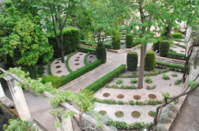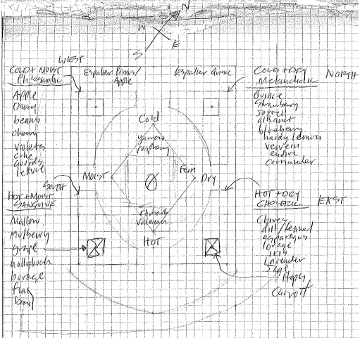So now that you have an idea about the doctrine of humors in the context of Plimoth, you can follow along as I explain my task of translating this medical theory into landscape design as a museum exhibit. The general concept and desire from the client, the museum experience group here at Plimoth, was to literally arrange the plants by humor to best aid learning and experience in real time while also providing an English medieval garden experience. In terms of case studies, as far i could research there were no known cases of humoral gardens arranged by humor existing in the United States. Some, such as Evergreen College in Washington State had an apothecary garden with plant labels expressing the various humors, but no such arrangement. Abroad, the most clear precedent i could locate was the circular Minerva Garden at the Medical School of Salerno, Italy, which features a medicinal garden arranged by humors dating from at least the 17th century. Its very handsome as you can see.