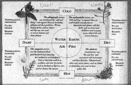 The Doctrine of Humors teaches that the human body is made up of four substances — or humors. Each humor is tied to one of the four elements that make up the world: earth, air, water, or fire. Each humor also has a unique combination of qualities; it is either “hot” or “cold”, and either “wet” or “dry”. Each food was thought to have qualities like the humors, and could thereby help keep the person healthy by keeping their humors “balanced.” A choleric person — too hot and dry — could be treated with cold, wet foods such as lettuce or pears. Likewise, a phlegmatic person, who